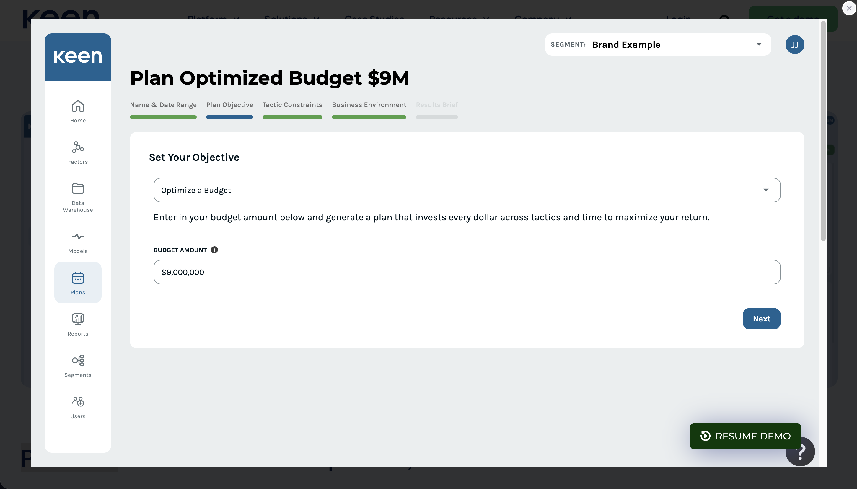Overview: Keen’s platform centers on marketing mix modeling and optimization with an explicit goal of connecting marketing investment to revenue/profit and bridging marketing + finance planning.