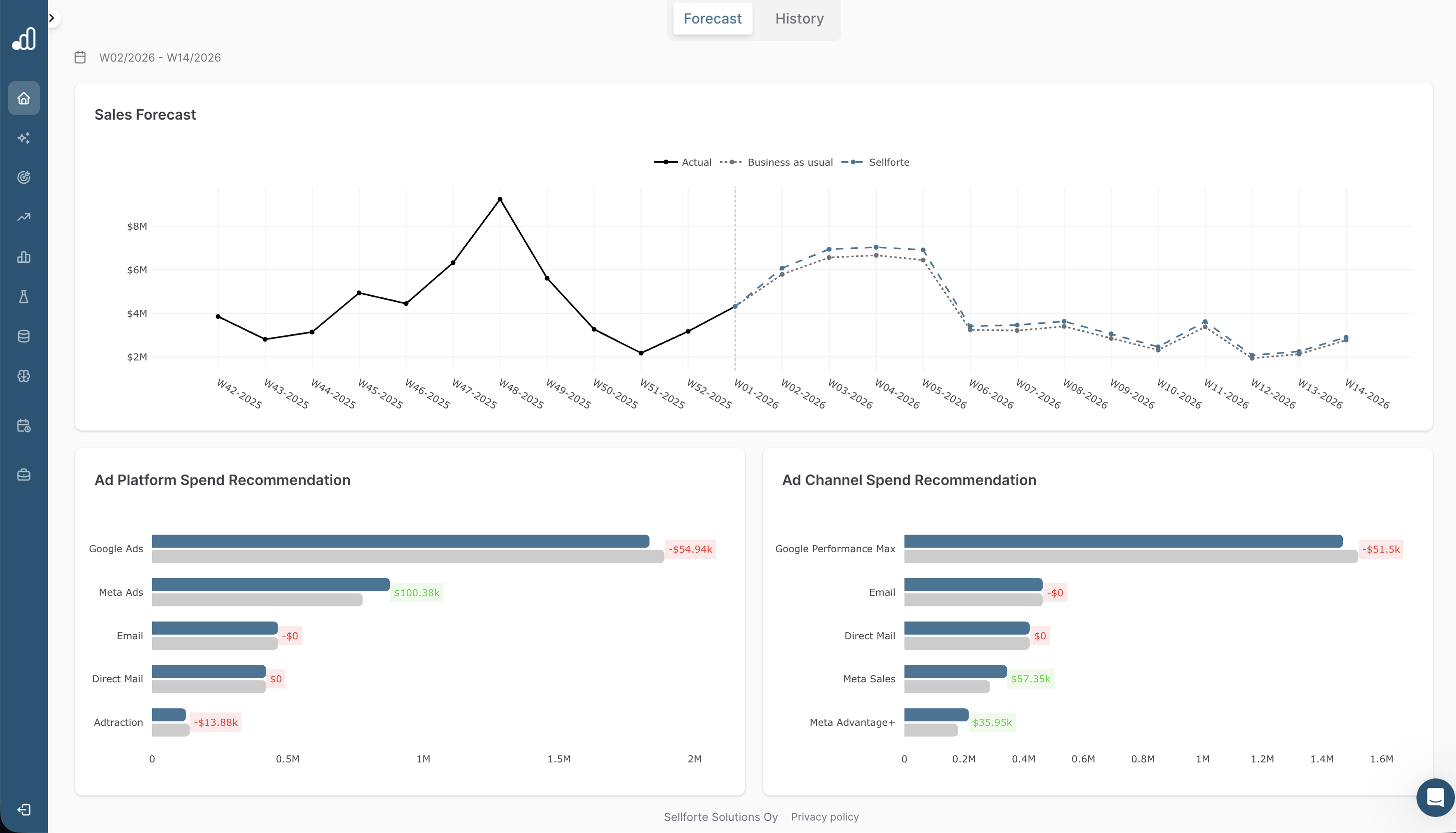 Best for: Ecommerce businesses who want the most advanced MMM solution for optimizing media spend on channel-level and campaign/ad set level. Contrary to other mid-market MMM software, Sellforte is enterprise-grade and can scale with the business as offline media and new sales channels are taken into use.