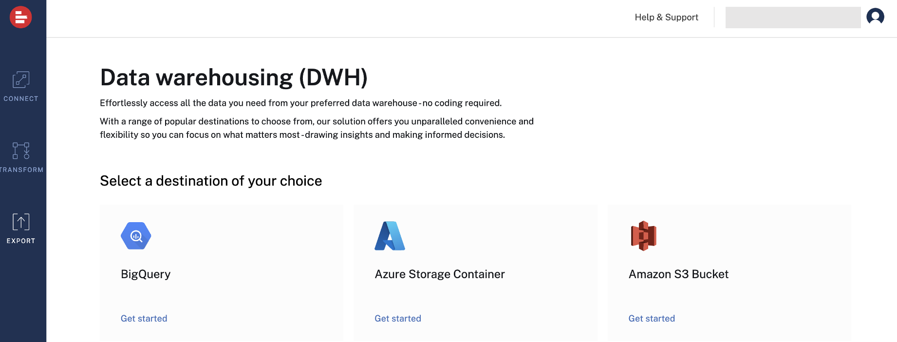 Log in to your account at hub.supermetrics.com and use the side menu to navigate to "Export" > "Data warehousing".