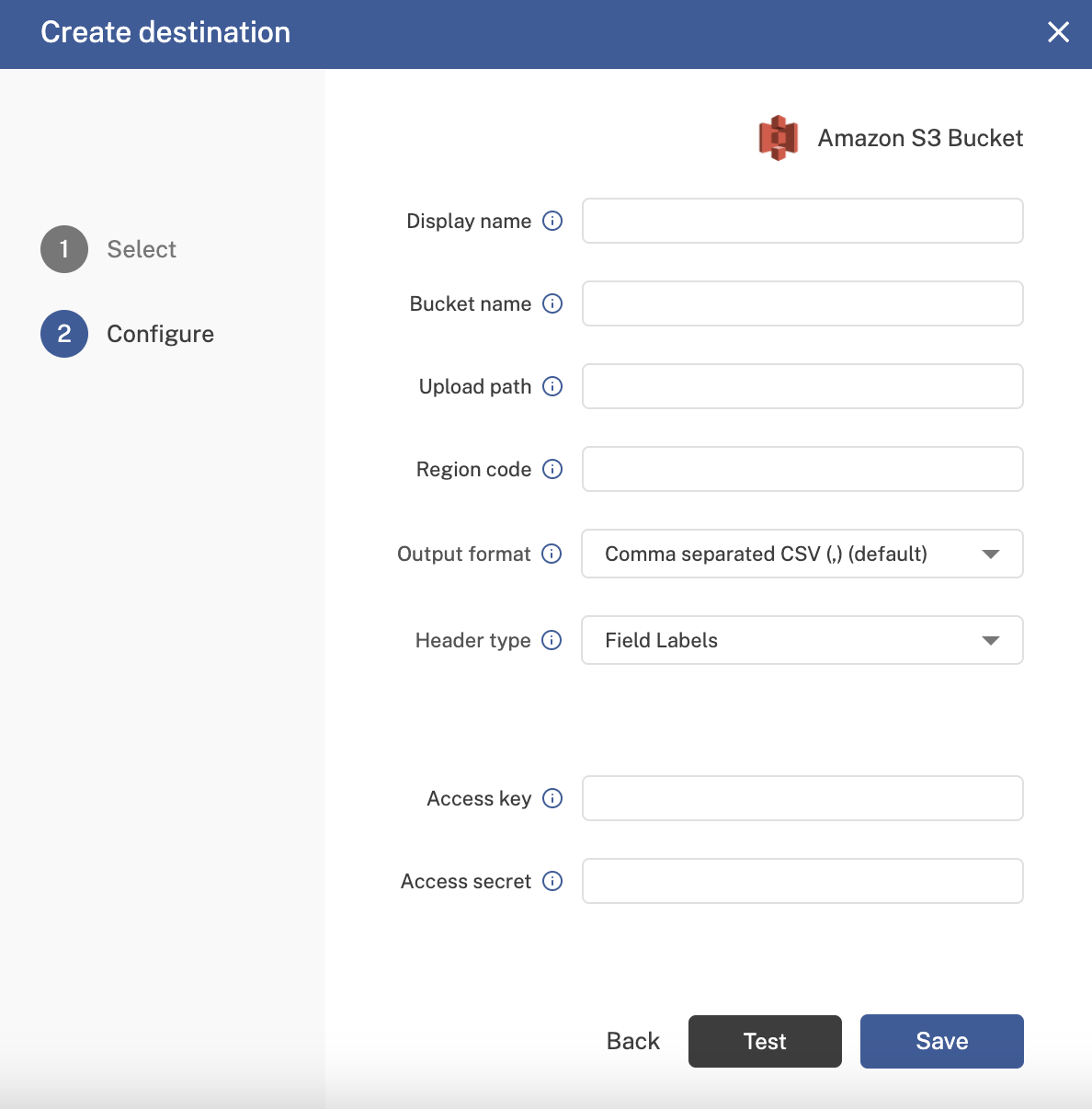 Choose Amazon S3 Bucket, and then "Create destination" pop up will open. Write or select the following details. Your Sellforte contact will provide the detailed bucket information.