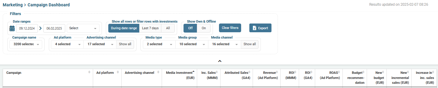 Note that for some campaigns, this result can be negative. Since the campaign dashboard always works within the current budget, increasing the budget for some campaigns means decreasing the budget for another campaign. Decreasing a certain budget may result in a decrease in incremental sales for that campaign, but the goal is of course to simultaneously increase incremental sales for the campaigns whose budget is being increased.