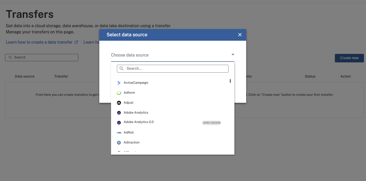 Go to "Export" -> "Transfers". Here you can manage all the transfers, thus integrations to different destinations. Click "Create new".