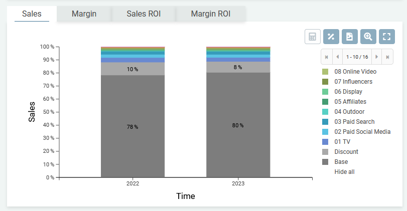 Understand marketing’s incrementality vs. base and other factors: Marketing's contribution to company's sales can vary from company, and Marketing Mix Modeling helps reveal it for your company. In the example below, "base" is ca. 80%, discounts are ca. 10%, and media contributes the remaining 10%.