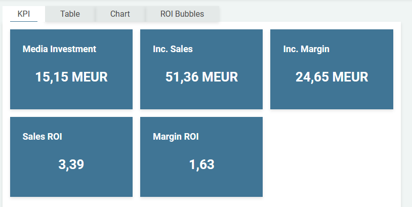 Track overall performance KPIs, such as ROI, marketing-driven sales: Improving marketing ROI starts from measuring it, and tracking how it develops over time. In the example below, company gets 3,39EUR sales back for every 1EUR invested in marketing.