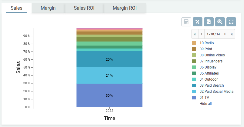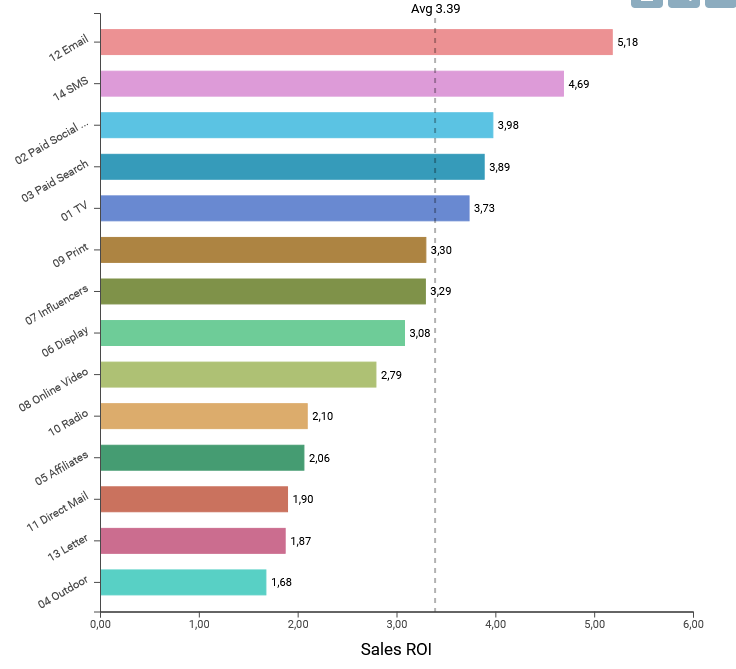 Understand each media channel’s contribution to performance: After the big picture is getting clear, it's time to dive deeper. How are the different media channels contributing to marketing performance. Below are a few good overviews to start from, first one telling the share of each medium from marketing-driven sales, and the second one telling the ROI of each medium.
