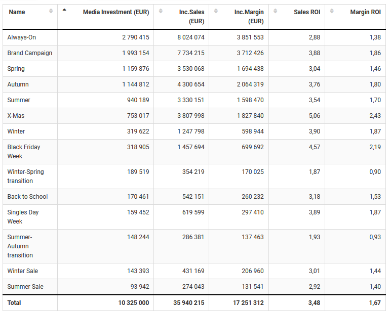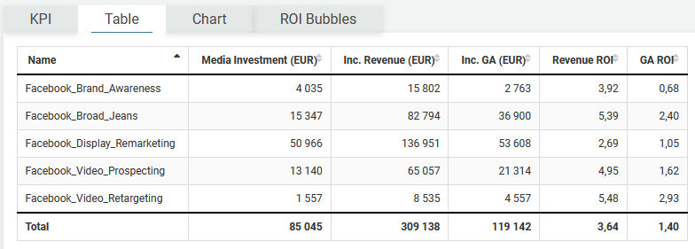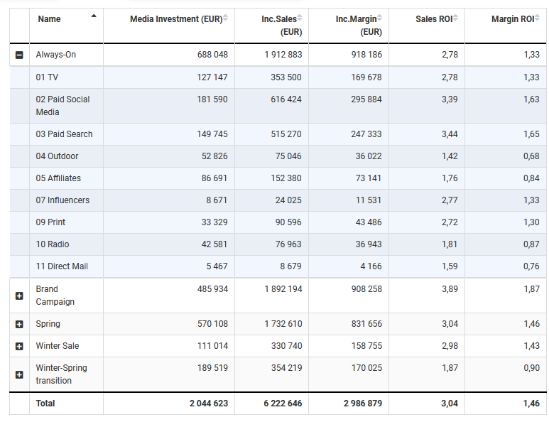 Review performance by media channel within the campaign type: Next step is to dive deeper into media within a campaign type. This can be done in several ways, for example by looking at them in a table view.