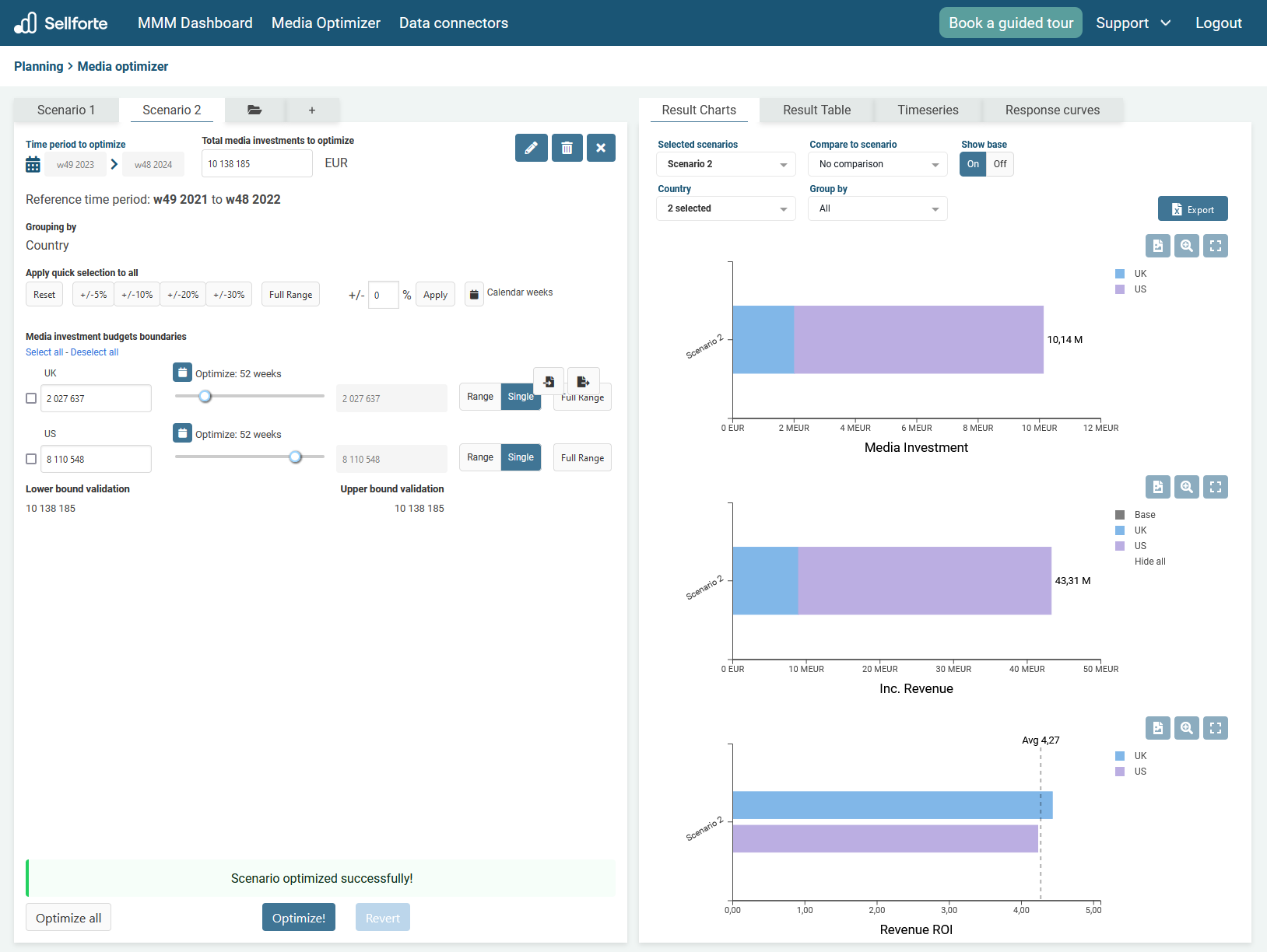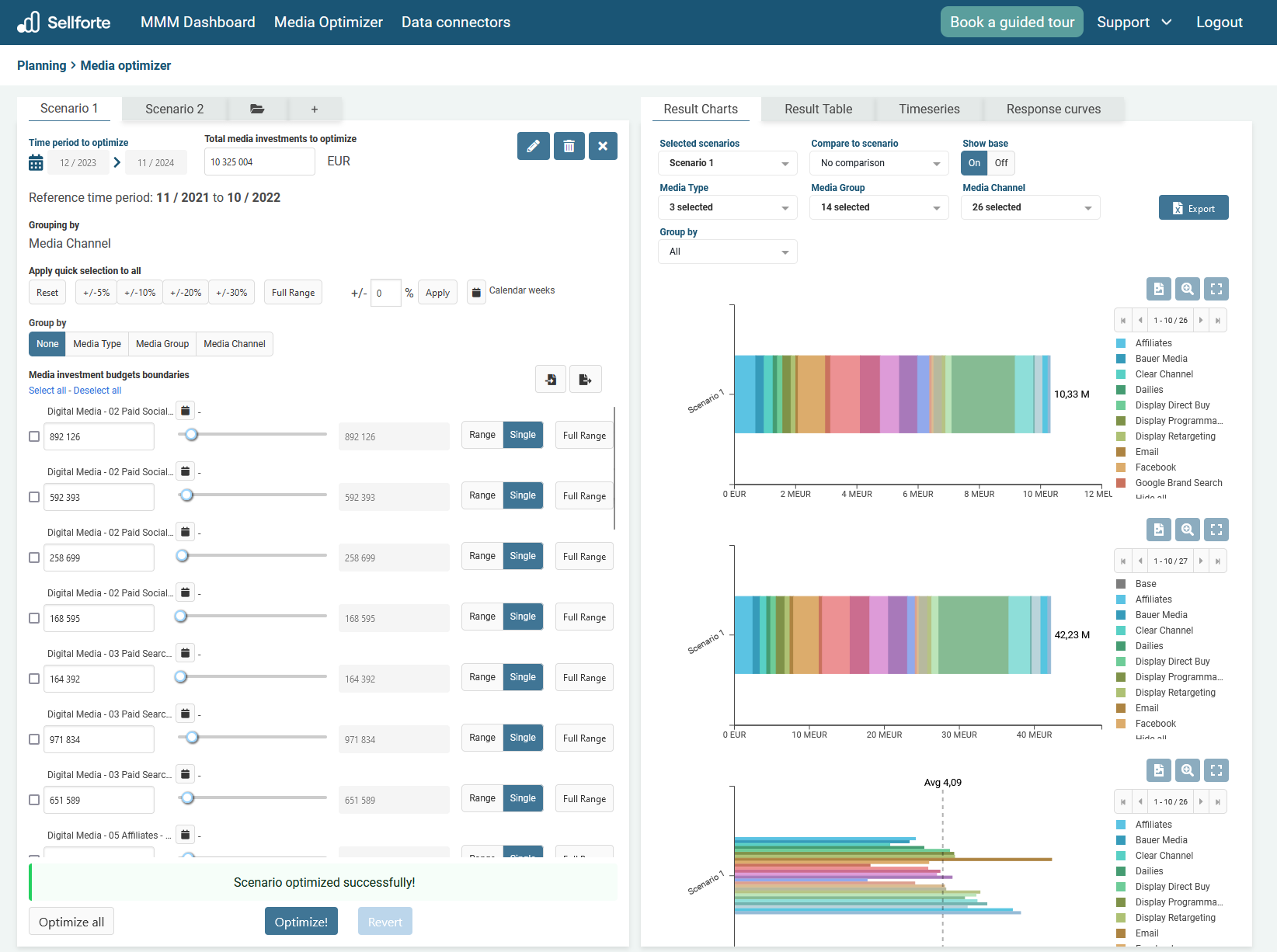 Get recommended budget by media channel: Marketing Mix Modeling can provide optimal budget allocations into different media. Below is an example from Sellforte's Media Optimizer, where the user has selected optimization parameters on the left, and can see the optimal budget allocation and expected ROI and sales on the right.