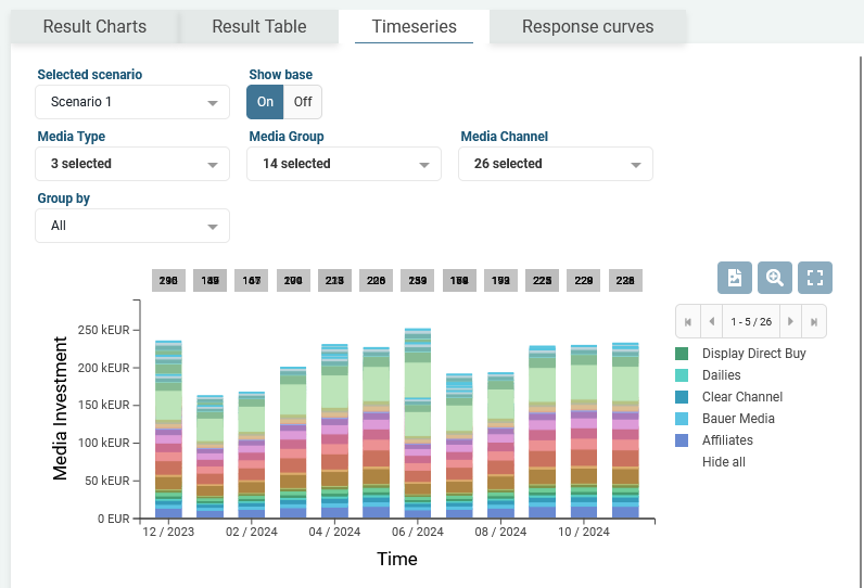 Get recommended spend by media channel and timing: Marketing Mix Modeling can provide optimal budget allocations across media for different campaign types. Below is an example from Sellforte's Media Optimizer, where the user has optimized an optimized "always-on"-campaign type.