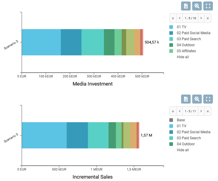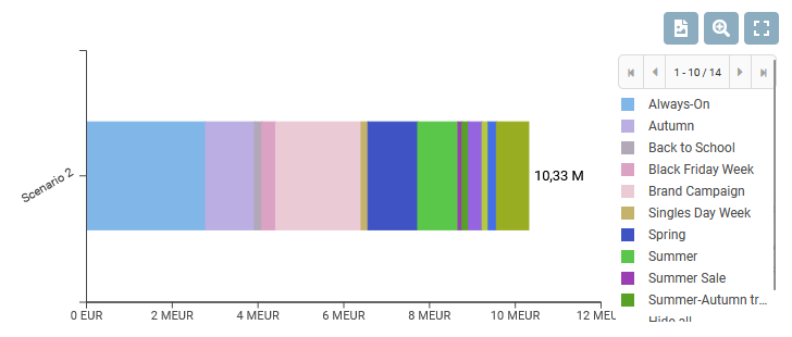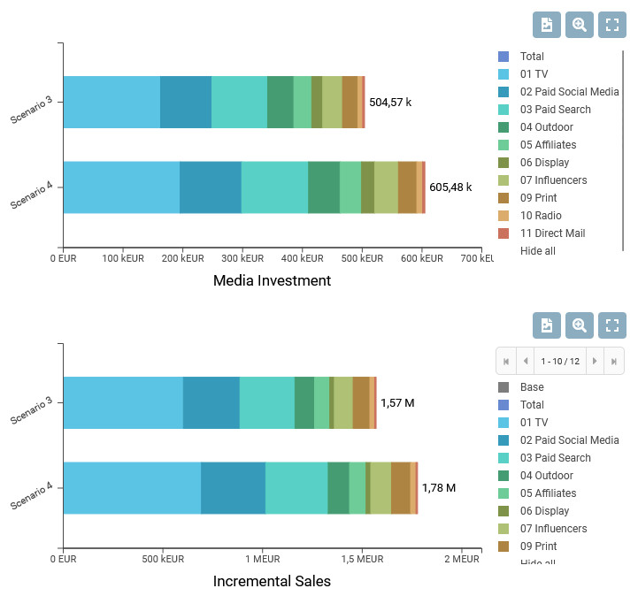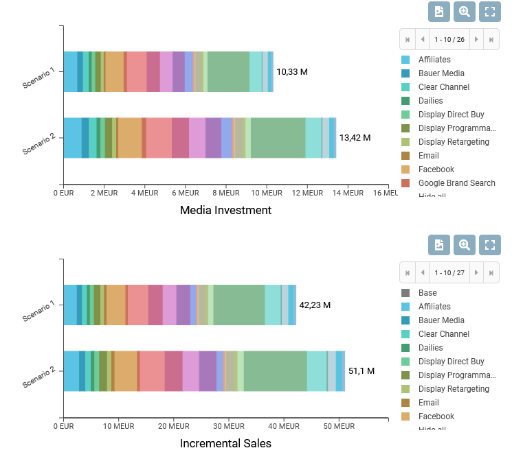 Test budget allocation scenarios: Similarly, than in annual planning, it is helpful for the marketing team to assess how performance of the campaign type would change under different budget scenarios. Pictures below show comparison of two different scenarios.