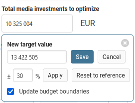 Test budget allocation scenarios: As part of budget planning, it is also important to test different scenarios. For example, the marketing team might want to argue more budget to from the CFO by building a business case for it. Or the CFO might ask to cut costs, and the marketing team can help the CFO to understand cost cutting's implication to company's sales. Budget allocation scenarios can be easily tested with Sellforte's Media Optimizer by first changing total media investments to optimize, as illustrated below.
