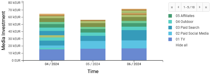 In addition to the total budget, it is relevant for the marketing team to understand how the investments should be split over time. Below is an examaple from Sellforte media optimizer on recommended monthly budget allocation.