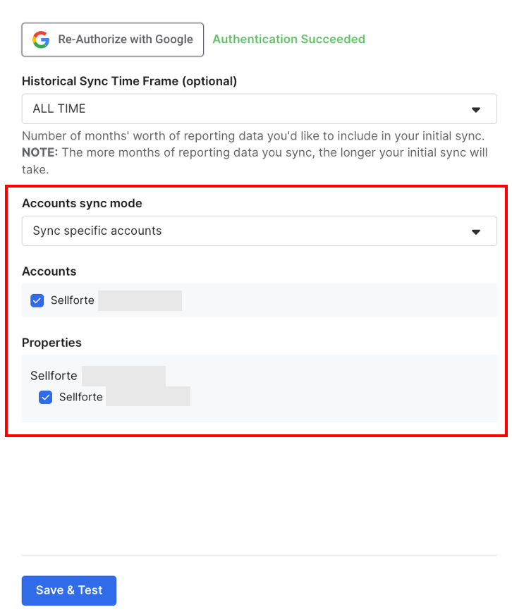 5. Choose account and properties for the sync