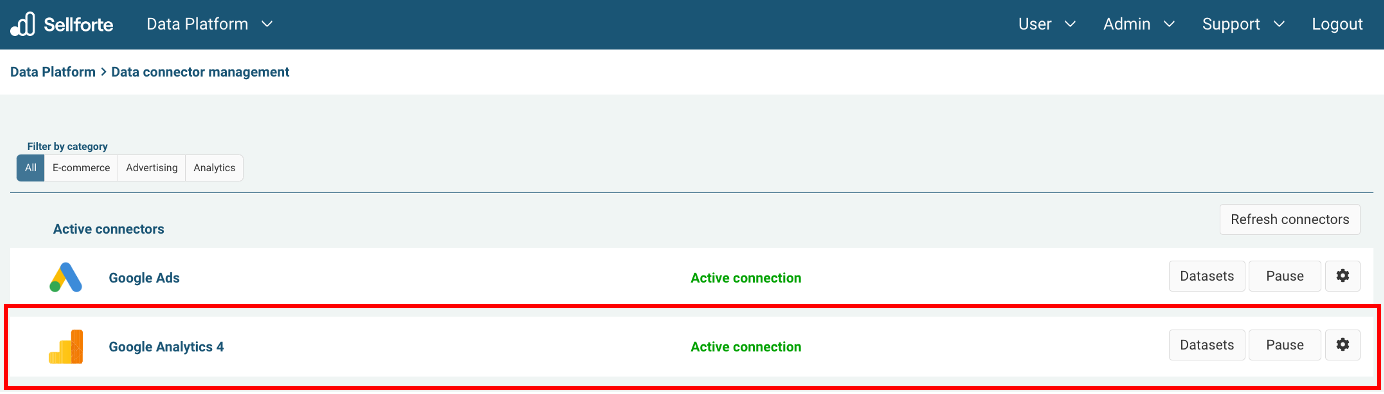 Google Analytics 4 is connected and data is fetched automatically with MMM specific schema to Sellforte.
