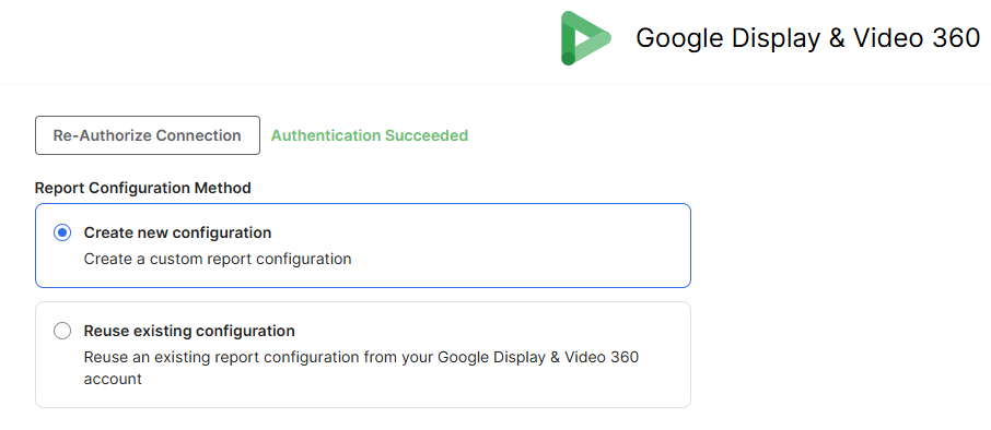 Choose "Create new configuration". Choose Partners and Advertisers accordingly. Choose "STANDARD" as a report type. Leave "Dimensions", "Metrics" and "Historical Sync Time Frame" as it is.