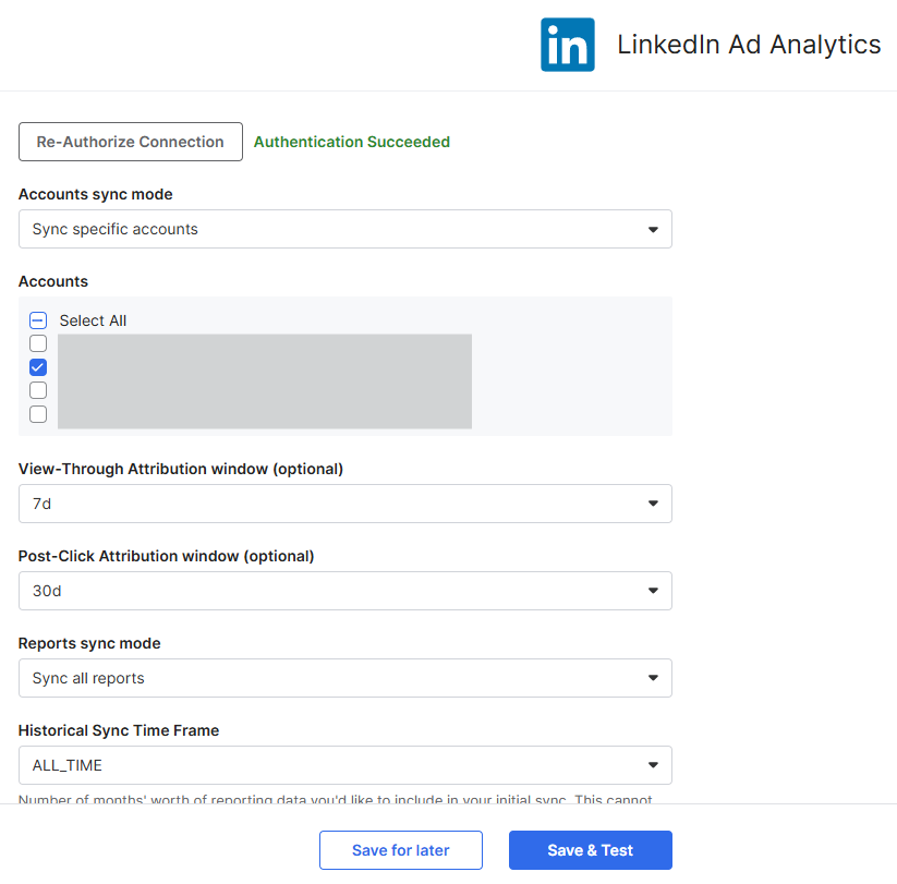 You can connect all, or choose specific Accounts from LinkedIn Ads. Choose the ones you need to include in the Sellforte MMM. Leave other options as they are.