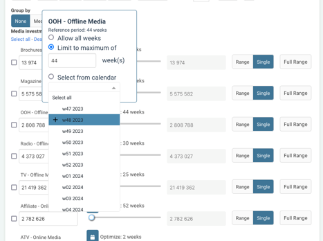 User can also specify the active weeks per marketing activity either by setting the number of weeks or by selecting specific weeks from a calendar.