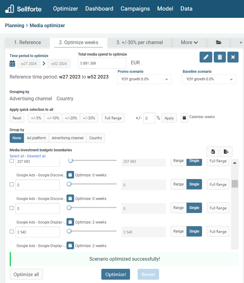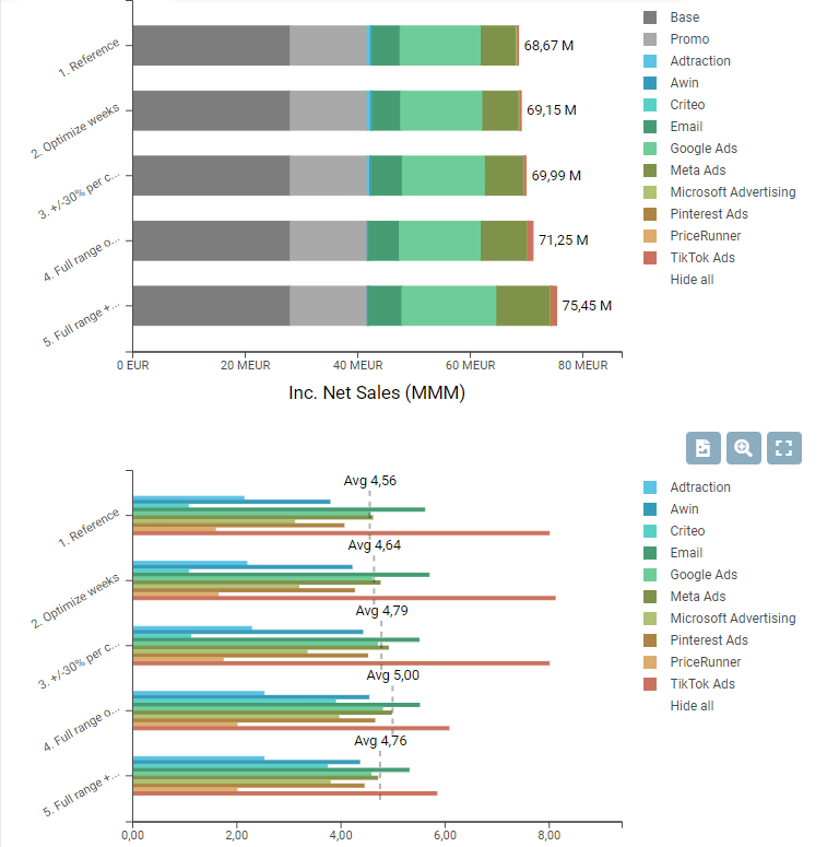 You can create different scenarios in order to optimize your current media budget or in order to gain insights on how to reach your new sales target, for example. You can find detailed instructions on how to create Media Optimizer scenarios here.