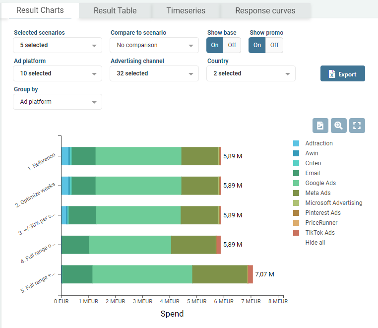 In the right panel of Media Optimizer, you can analyse different scenarios you have created and compare them with each other. You can simultaneously analyse and compare multiple different scenarios in order to evaluate different possibilities your marketing optimization has.