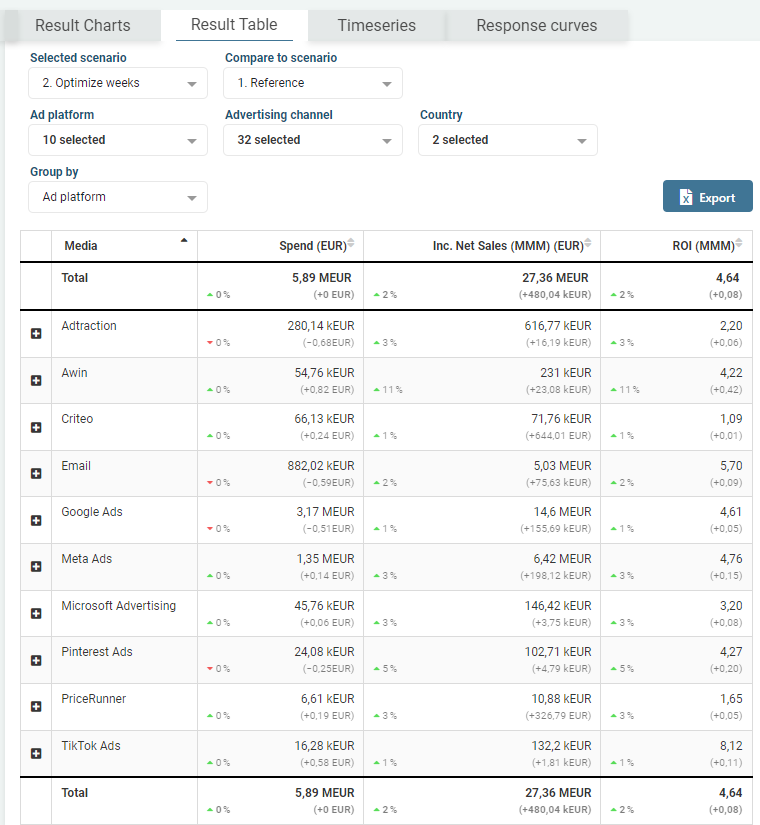 In the Results Table you can choose one scenario and view the investments, sales and ROI metrics in a more detailed table view. You can also compare two scenarios against each other.