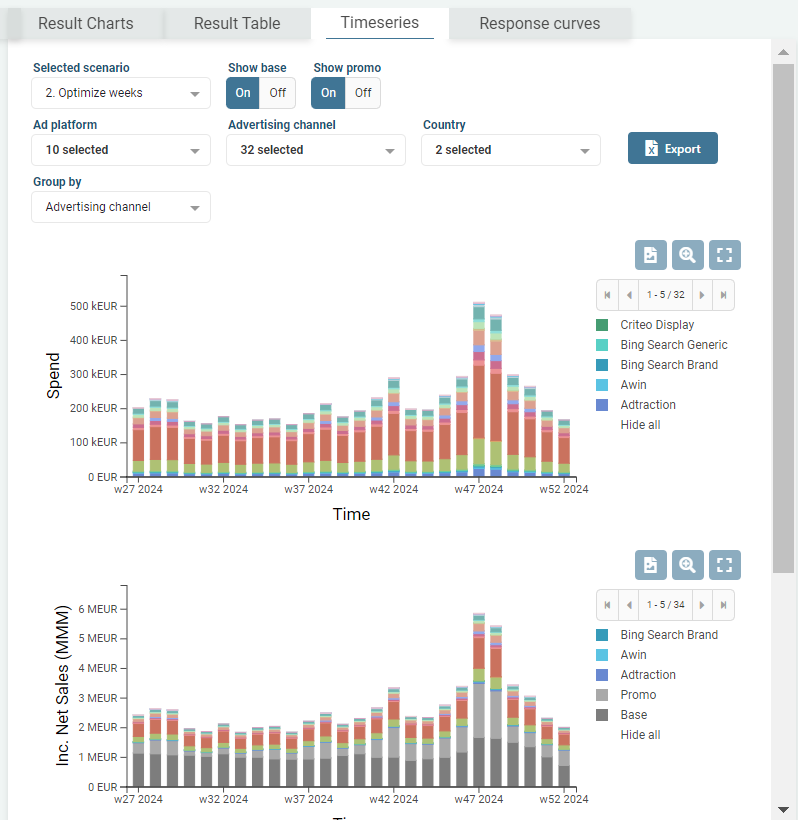 In the Timeseries Tab you can choose one scenario and view how investments, sales and ROI metrics allocate in a weekly view. You can gain insights on how to optimize your budget between weeks and months.