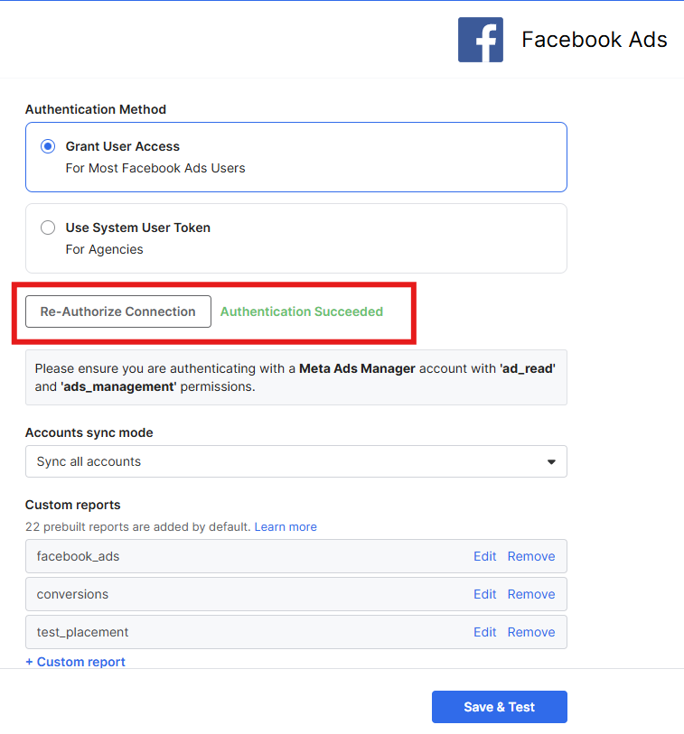 The specific authorization method for the connector will determine the exact process. You might encounter a button like below, that will direct you to the platform's authorization workflow. Even if a message indicates "Authentication Succeeded," it's important to proceed by clicking "Re-authorize Connection" and going through the platform's authorization steps once more.
