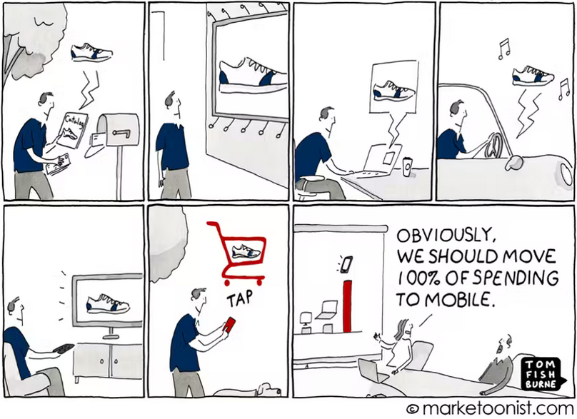 Last-click attribution paints a quite distorted picture of how marketing is driving results. Comic by marketoonist