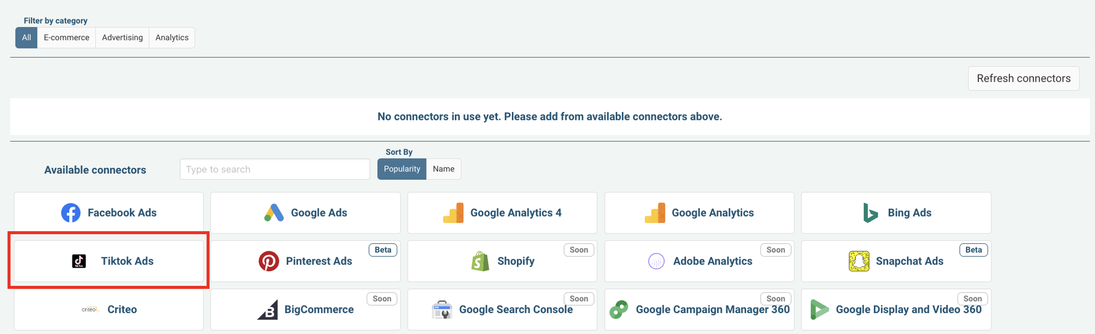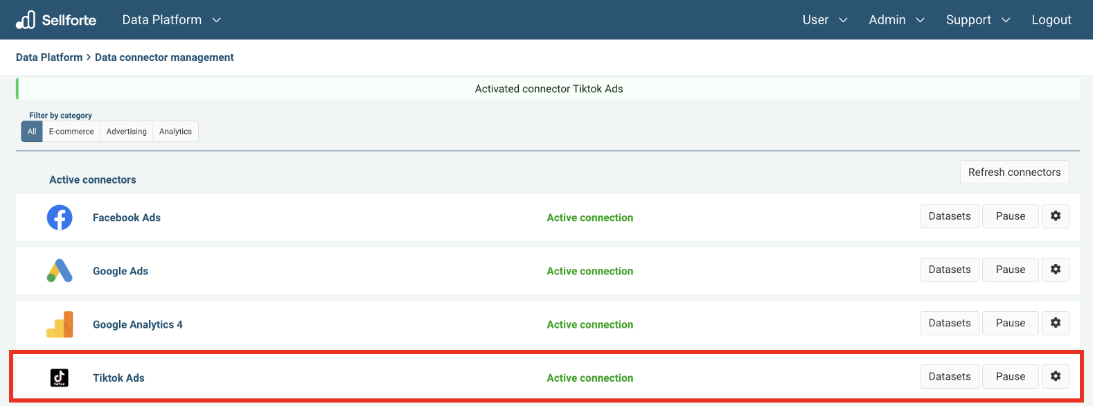 TikTok Ads is connected and data is fetched automatically with correct MMM schema to Sellforte.