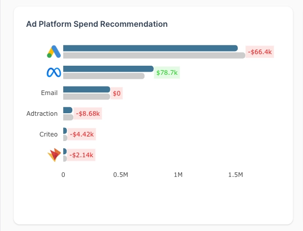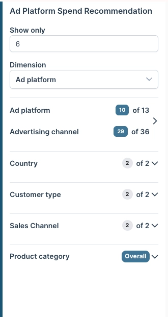 Provides spend recommendations for a selected dimension (e.g., channel, platform, region).