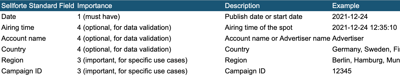 1. Data field descriptions and examples - named after data source e.g. "TV Spots"